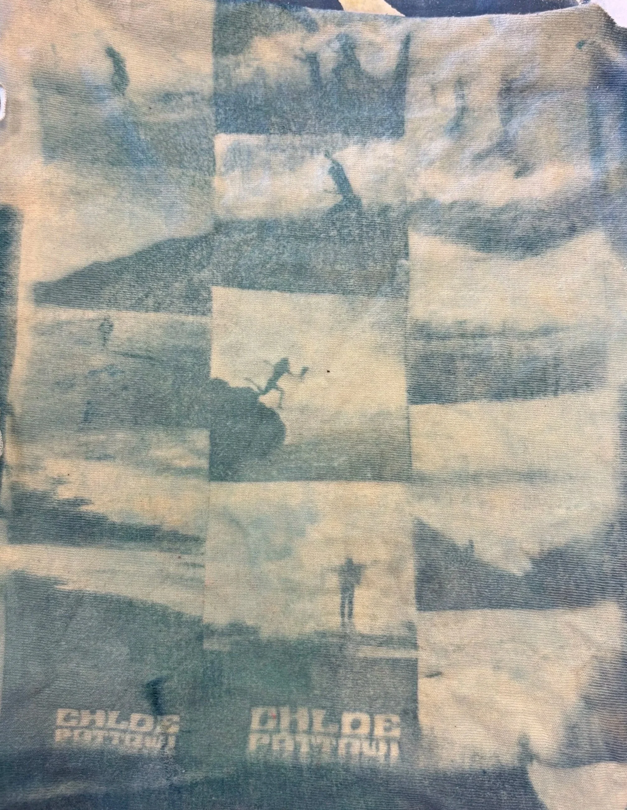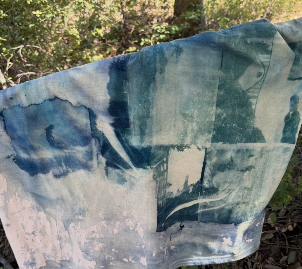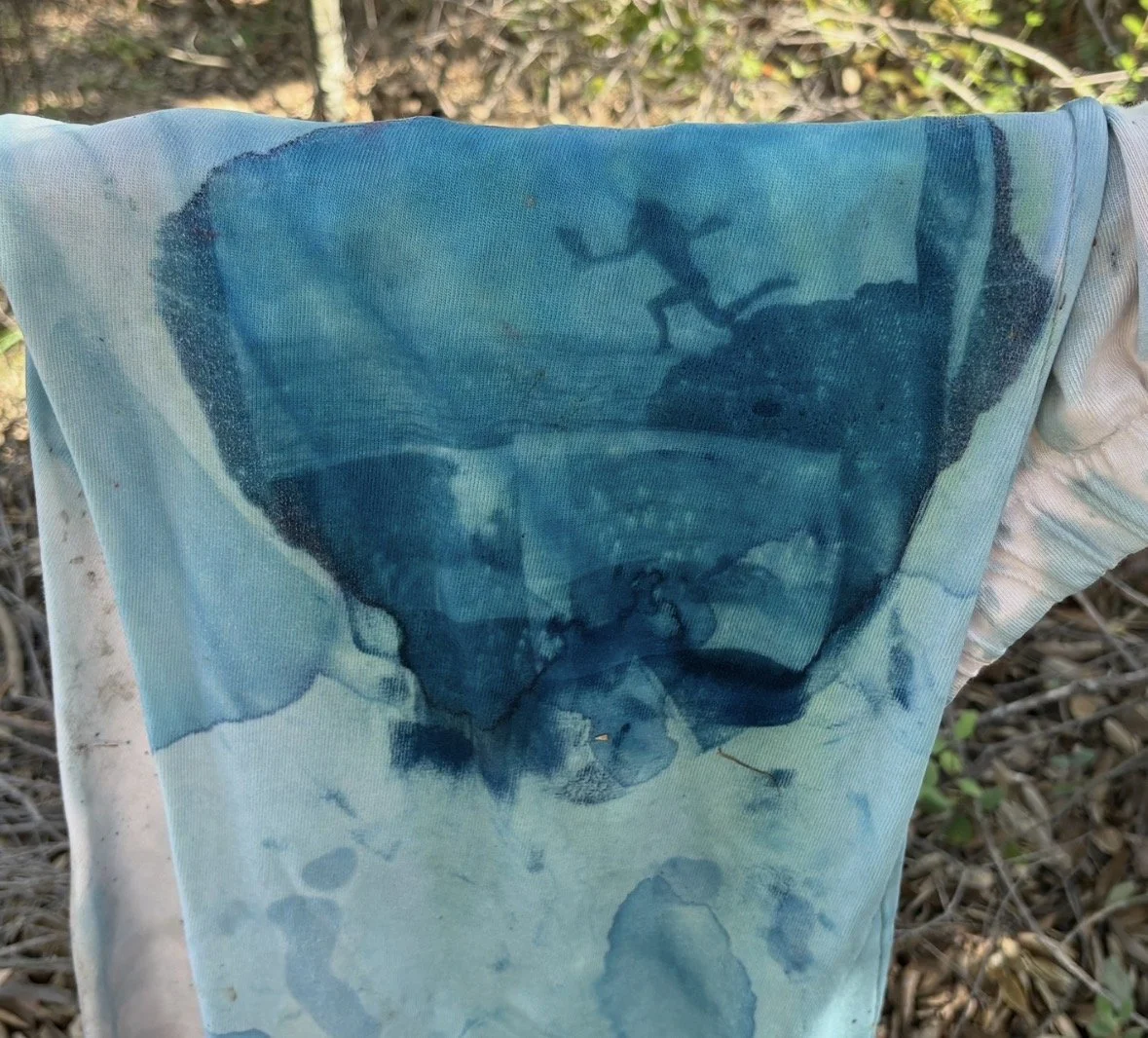 I first learned about cyanotypes in my high school darkroom photography class, where we used our film negatives to create unique sun prints. Cyanotype printing is activated by UV light, and the process involves painting the cyanotype solution onto a material of your choice, then placing objects or inverted images on top and leaving them in the sun to develop. After the photos develop, you take your creation and run them under water to wash out the excess dye, and then you are done!